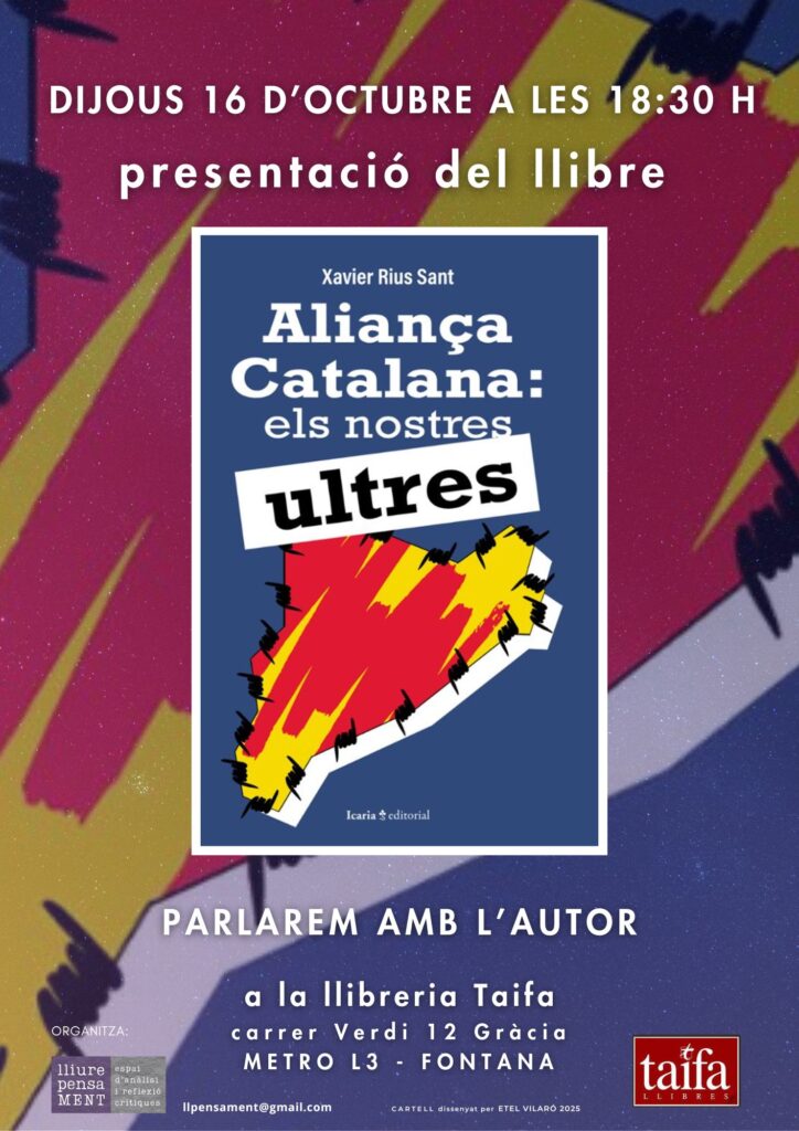 - PRESENTACIÓ DEL LLIBRE DE XAVIER RIUS: “ALIANÇA CATALANA: ELS NOSTRES ULTRES”El grup de Lliurepensament tanca la seva etapa a l’Ateneu Rosa de Foc amb aquesta presentació del llibre de Xavier Rius a la llibreria Taifa.“Aliança … Llegiu més